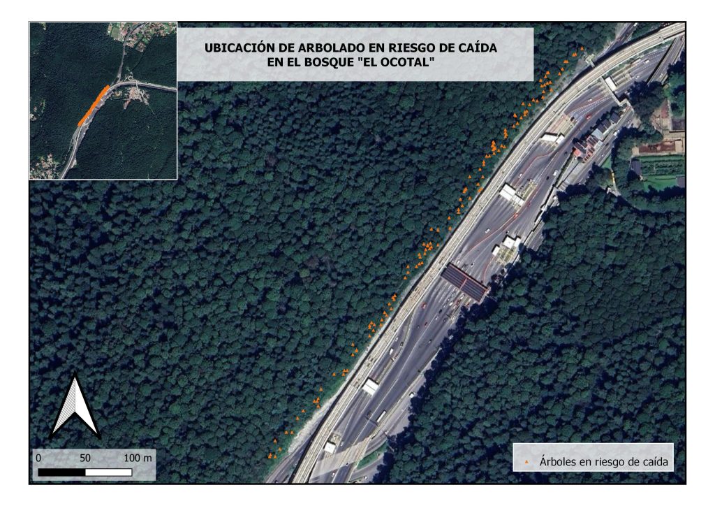 Mediante un dictamen elaborado conforme a la norma NADF-001-RNAT-2015 por personal acreditado por SEDEMA, se identificaron 124 árboles con riesgo de caída hacia la carretera federal México—Toluca.
